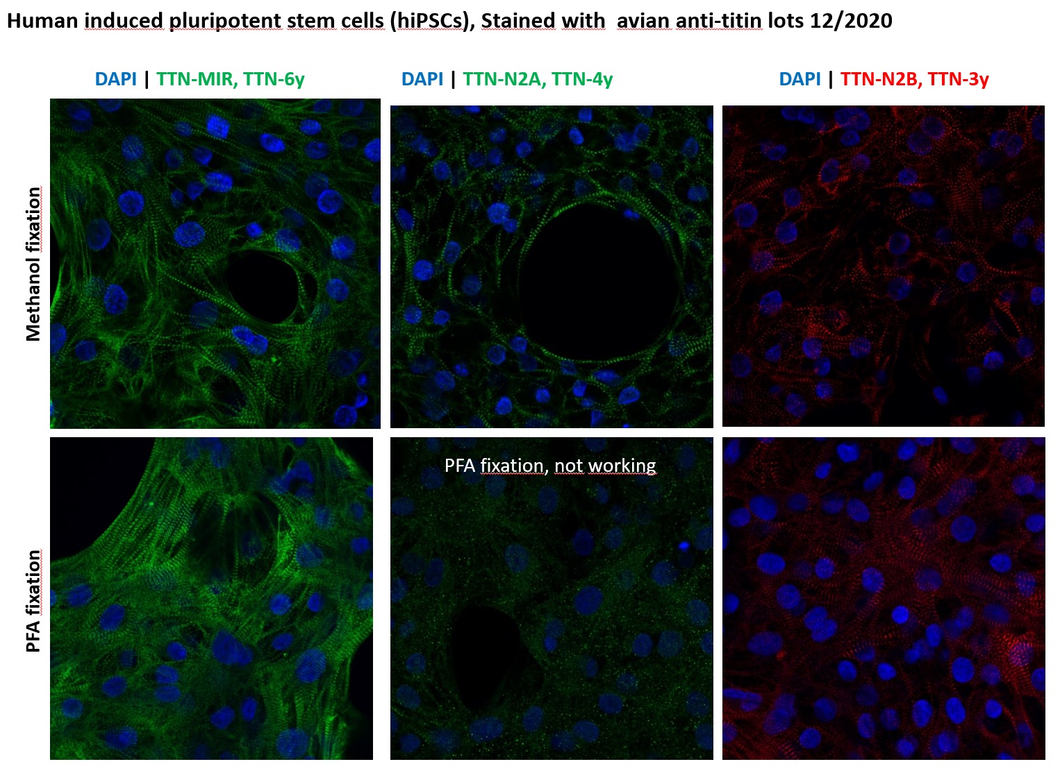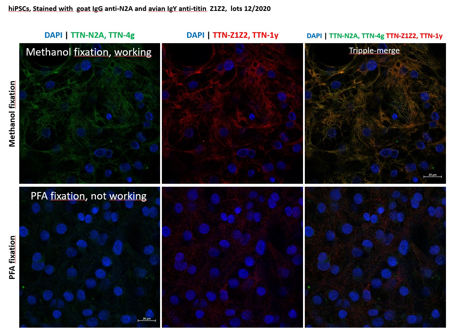 While myofibrillar proteins are almost always highly conserved between mammals, some of the titin spring elements and the nebulin N-terminal segments are less conserved between mouse and human. We therefore raised anti-Nebulin Nterm and anti-titin-N2B to the murine antigens. If you work with rodent models we recommend these (all other reagents cross-react well to all mammalian muscles).